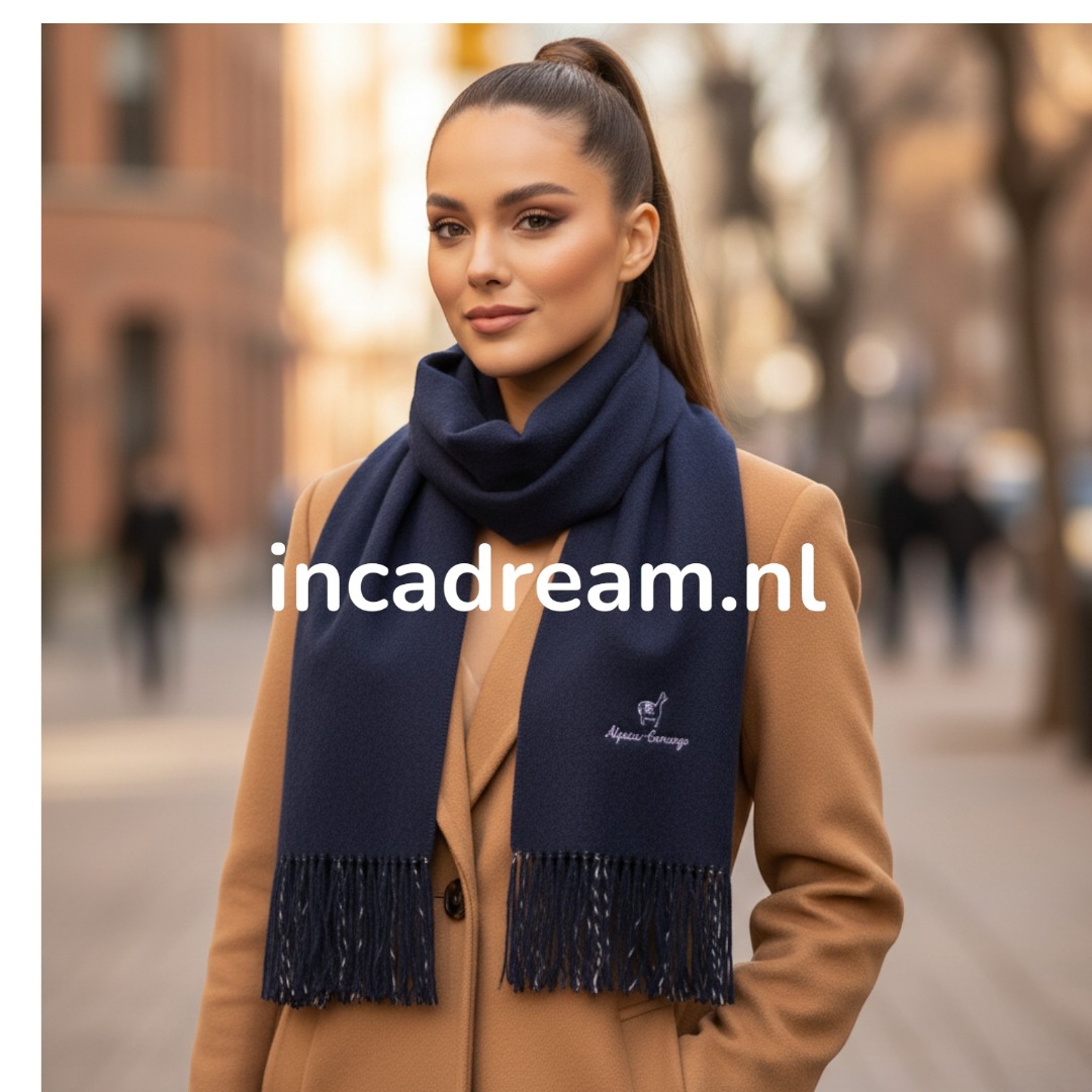 Prachtige effen Marine blauw alpaca sjaal voor dames en heren , lekker zachte en met een mooie glans, die net zo zacht is als hij eruit ziet in de foto. Deze alpacawol sjaal is geweven met 30% alpaca wol en 70% acryl. Alpaca wol kriebelt niet en is hypoallergeen van nature, De sjaal is geweven in de Peruaanse Andes.