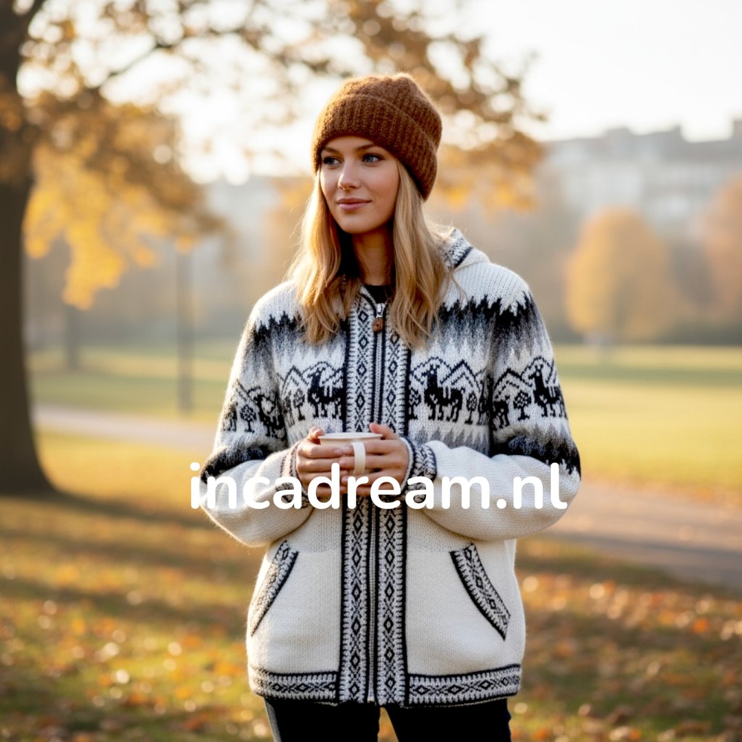 Alpaca is een hypoallergene wol die geen lanoline bevat en dus zachter is dan schapenwol en prikt niet, met een klassiek Andespatroon aan het borst voor en achter.