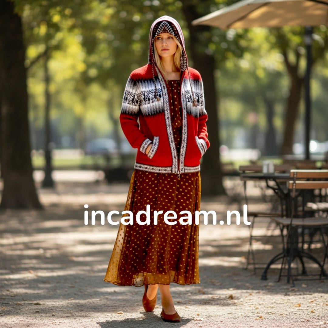 Alpaca is een hypoallergene wol die geen lanoline bevat en dus zachter is dan schapenwol en prikt niet, met een klassiek Andespatroon aan het borst voor en achter.