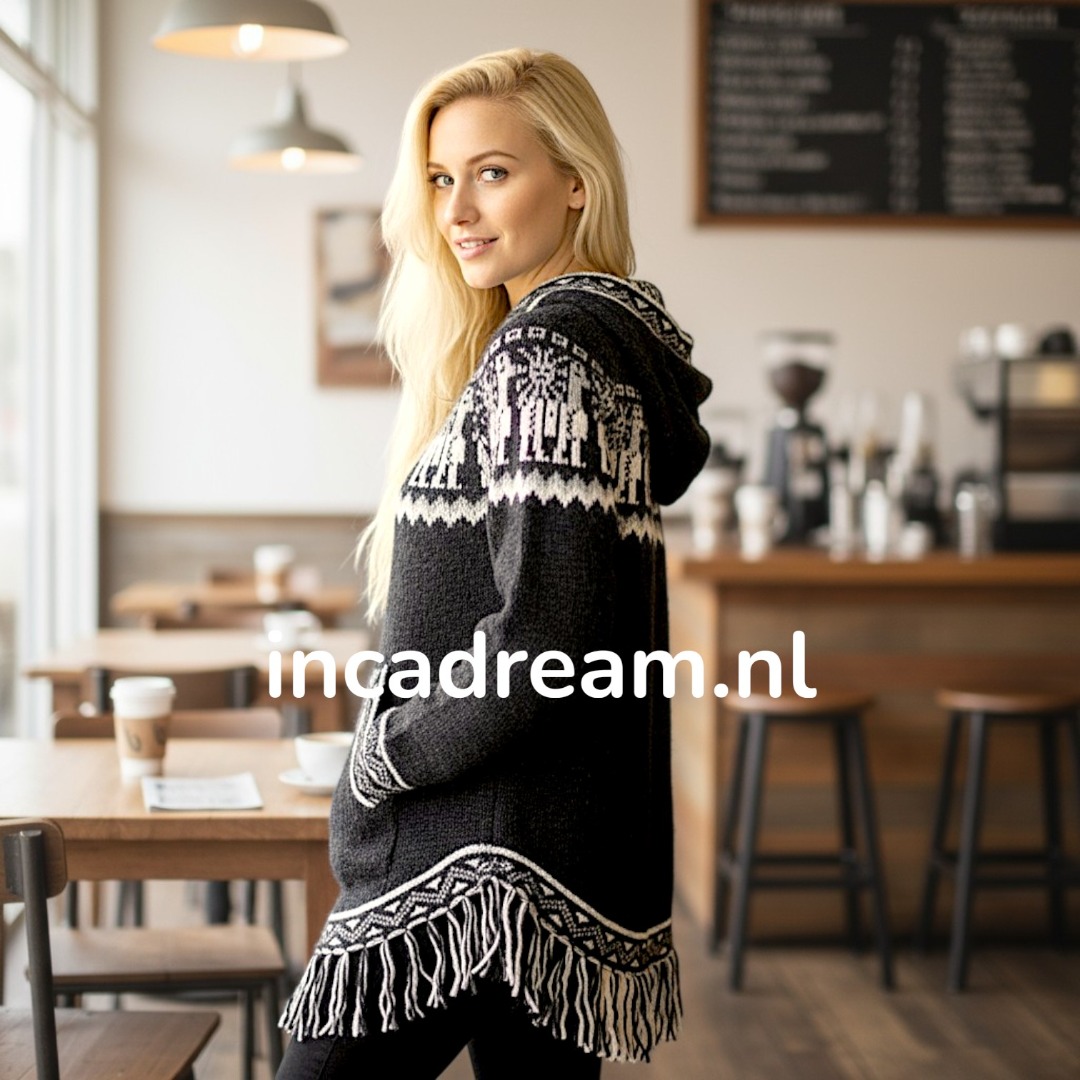 The Alpaca jumper is designed to fit the body softly and smoothly, made with Alpaca wool, this tuniek pullover is so soft you'll want to wear it around the clock! Featuring an oversized hood, a unique Inca tribe border design on the hem and cuffs, a criss cross string colar with beaded strings, it's possible to be super comfy and stylish simultaneously!