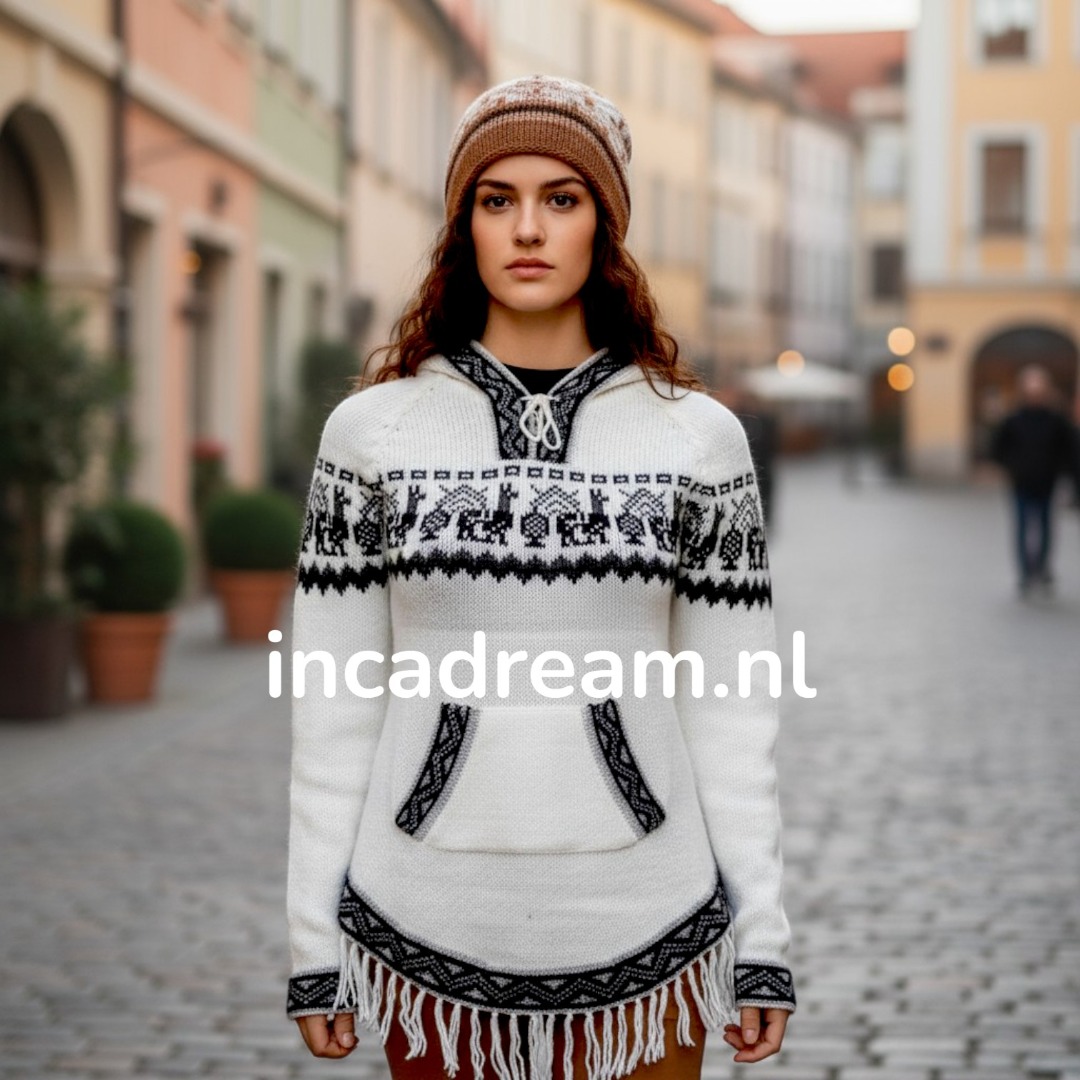 The Alpaca jumper is designed to fit the body softly and smoothly, made with Alpaca wool, this tuniek pullover is so soft you'll want to wear it around the clock! Featuring an oversized hood, a unique Inca tribe border design on the hem and cuffs, a criss cross string colar with beaded strings, it's possible to be super comfy and stylish simultaneously!
