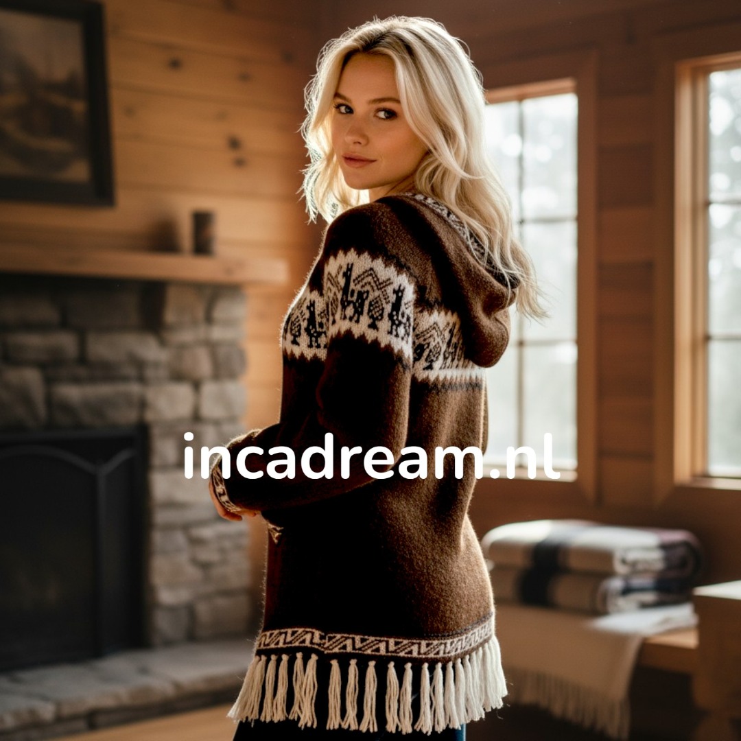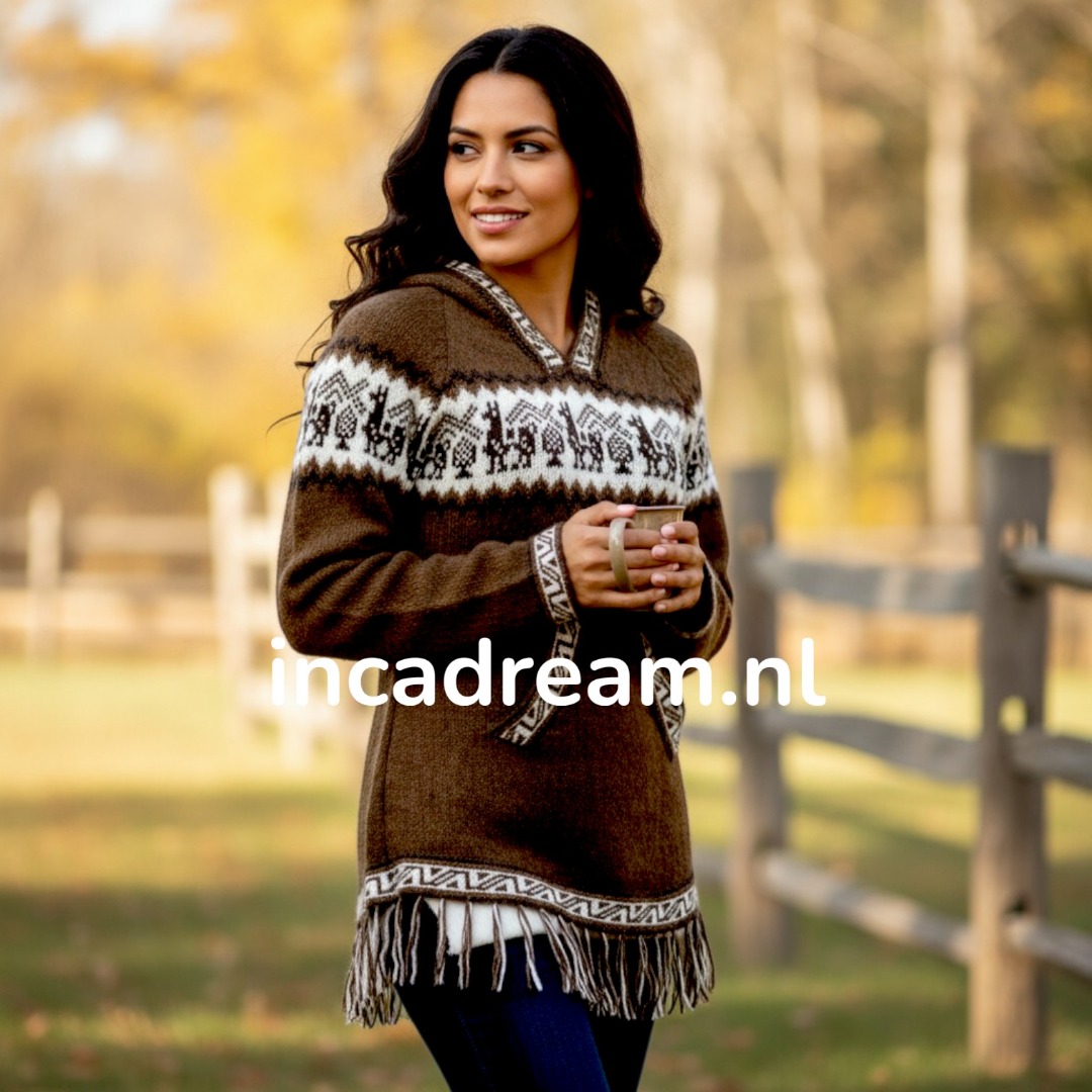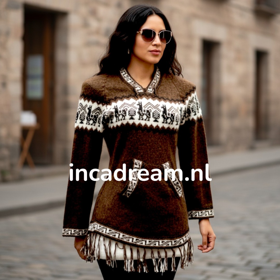 The Alpaca jumper is designed to fit the body softly and smoothly, made with Alpaca wool, this tuniek pullover is so soft you'll want to wear it around the clock! Featuring an oversized hood, a unique Inca tribe border design on the hem and cuffs, a criss cross string colar with beaded strings, it's possible to be super comfy and stylish simultaneously!
