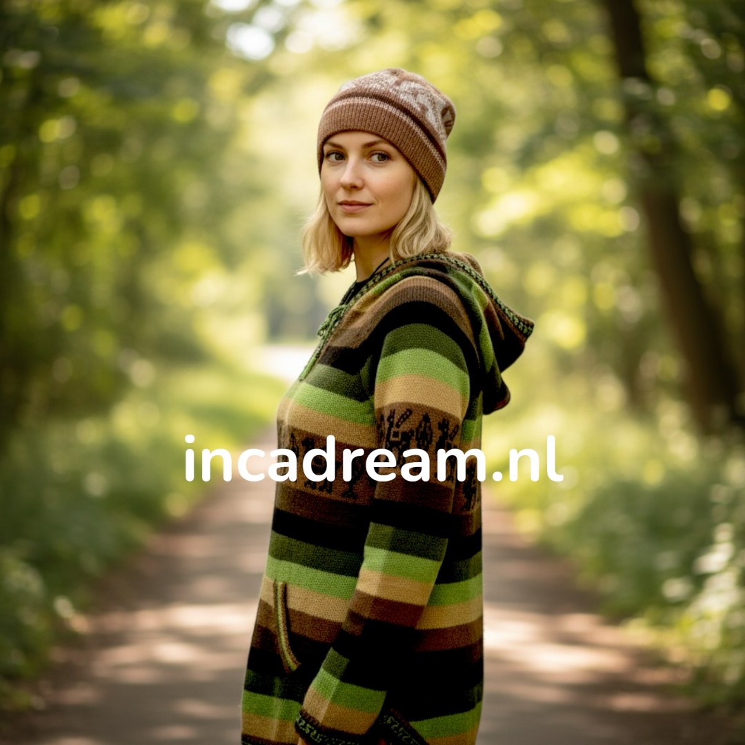 Alpaca knitted women's jumper and hat, Peruvian long pullover, striped jumper and hat. Very warm and cozy in the winter, but also light enough to wear during cool evenings in the summertime.