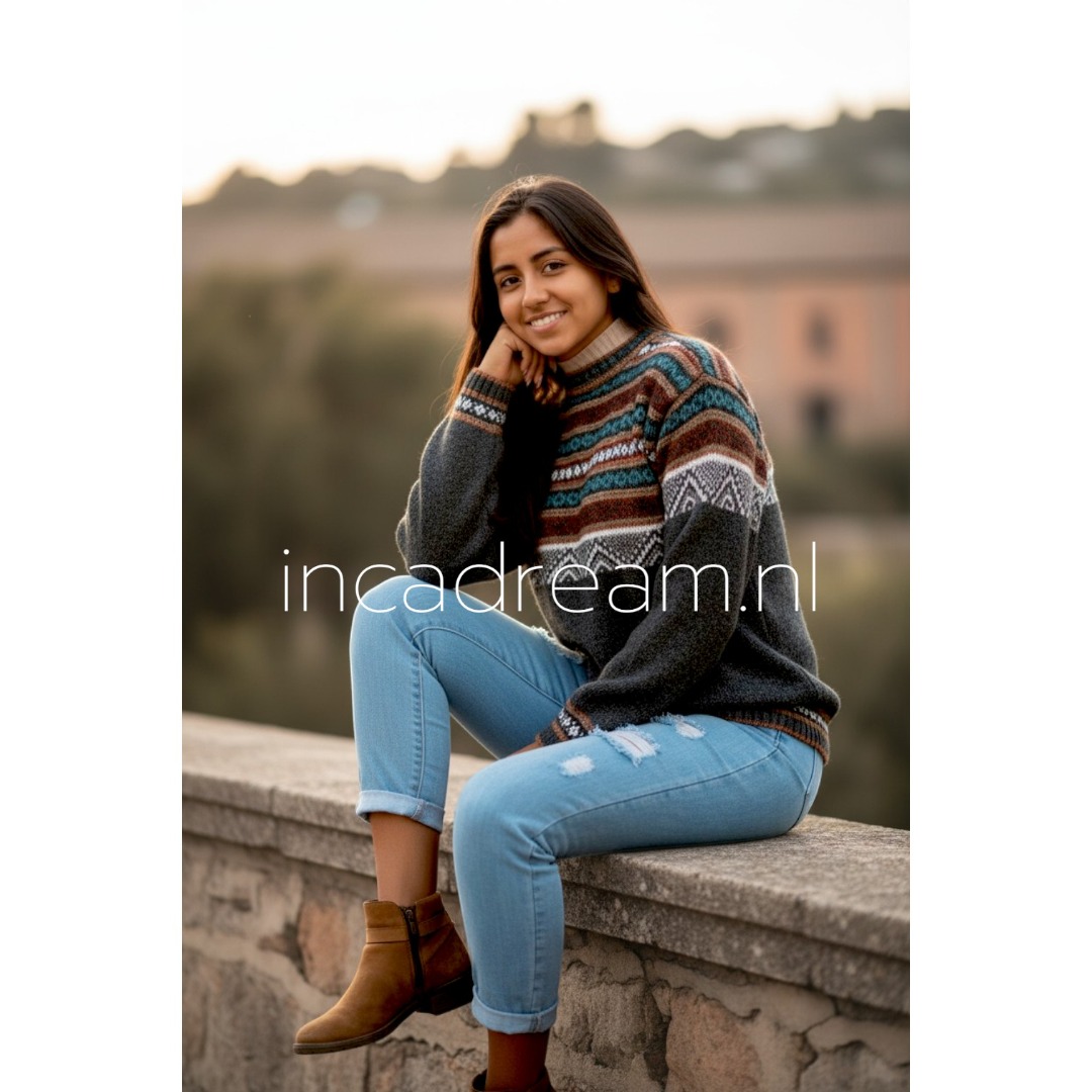 Deze alpaca sweater is een must in de garderobe van elke vrouw or man. Hij is gemaakt in een warme mix van alpacawol en heeft een ronde hals. Op de borst heeft een geometrisch patroon.
