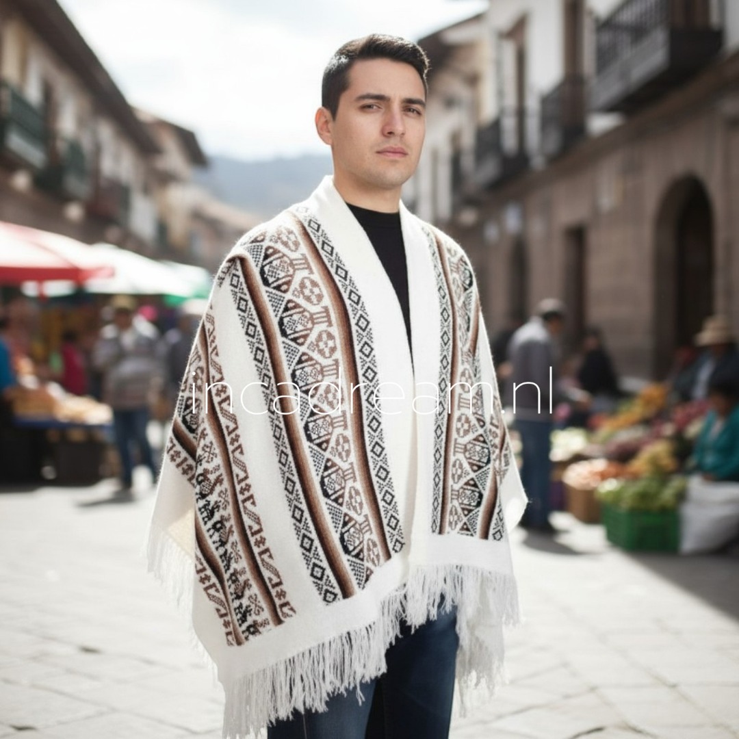 Deze alpaca wollen omslagdoek is lekker dik en heerlijk warm voor de winter. Met dit mooie kleuren conbinatie en de Inca patron is dit poncho een echte eyecather. Je kunt hem draperen als een poncho of dragen als oversized sjaal.