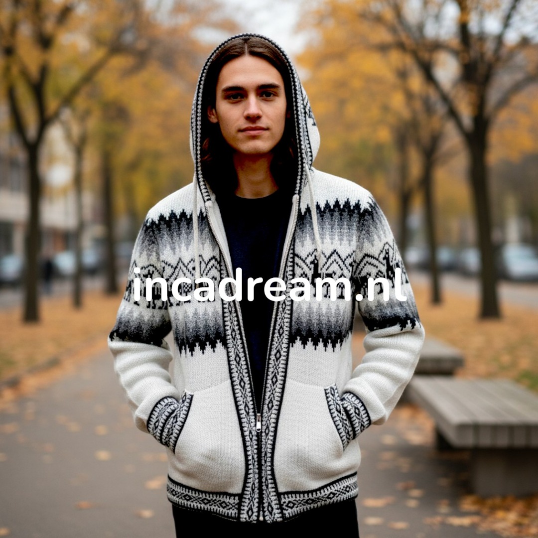 Alpaca is een hypoallergene wol die geen lanoline bevat en dus zachter is dan schapenwol en prikt niet, met een klassiek Andespatroon aan het borst voor en achter.