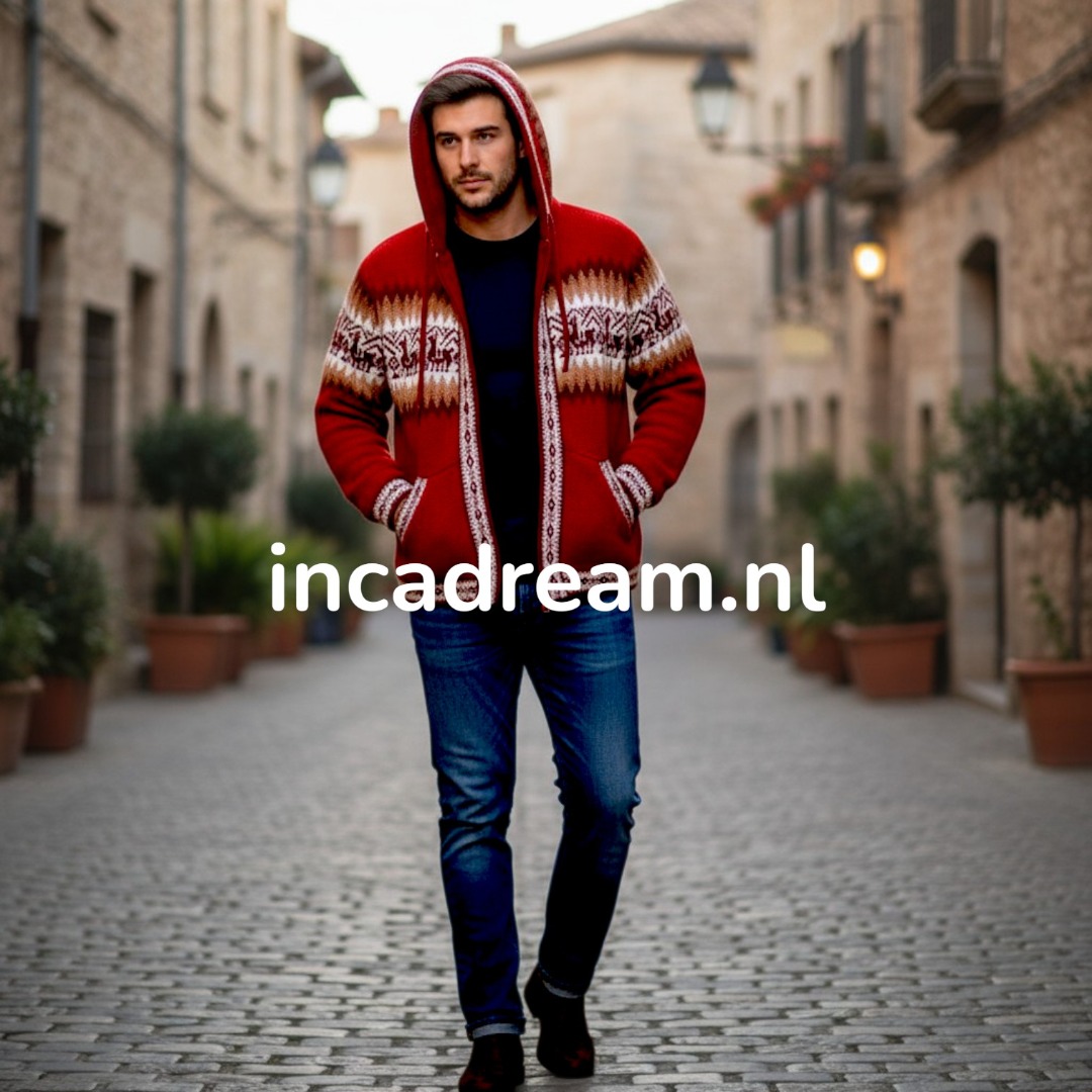Alpaca is een hypoallergene wol die geen lanoline bevat en dus zachter is dan schapenwol en prikt niet, met een klassiek Andespatroon aan het borst voor en achter.