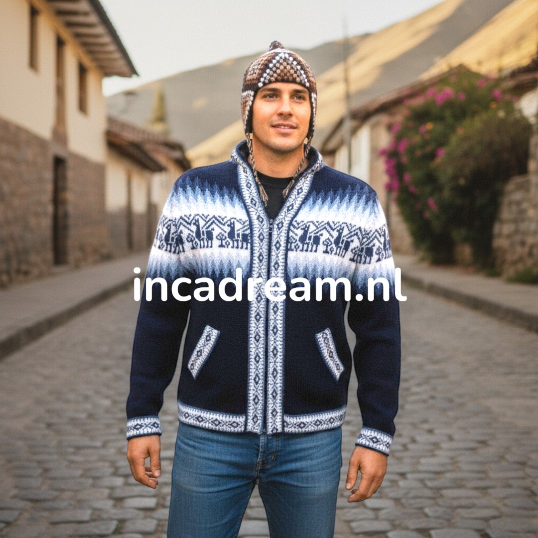 Alpaca is een hypoallergene wol die geen lanoline bevat en dus zachter is dan schapenwol en prikt niet, met een klassiek Andespatroon aan het borst voor en achter.