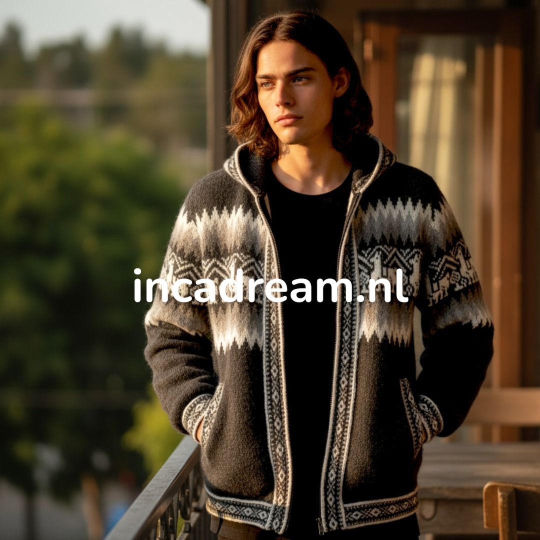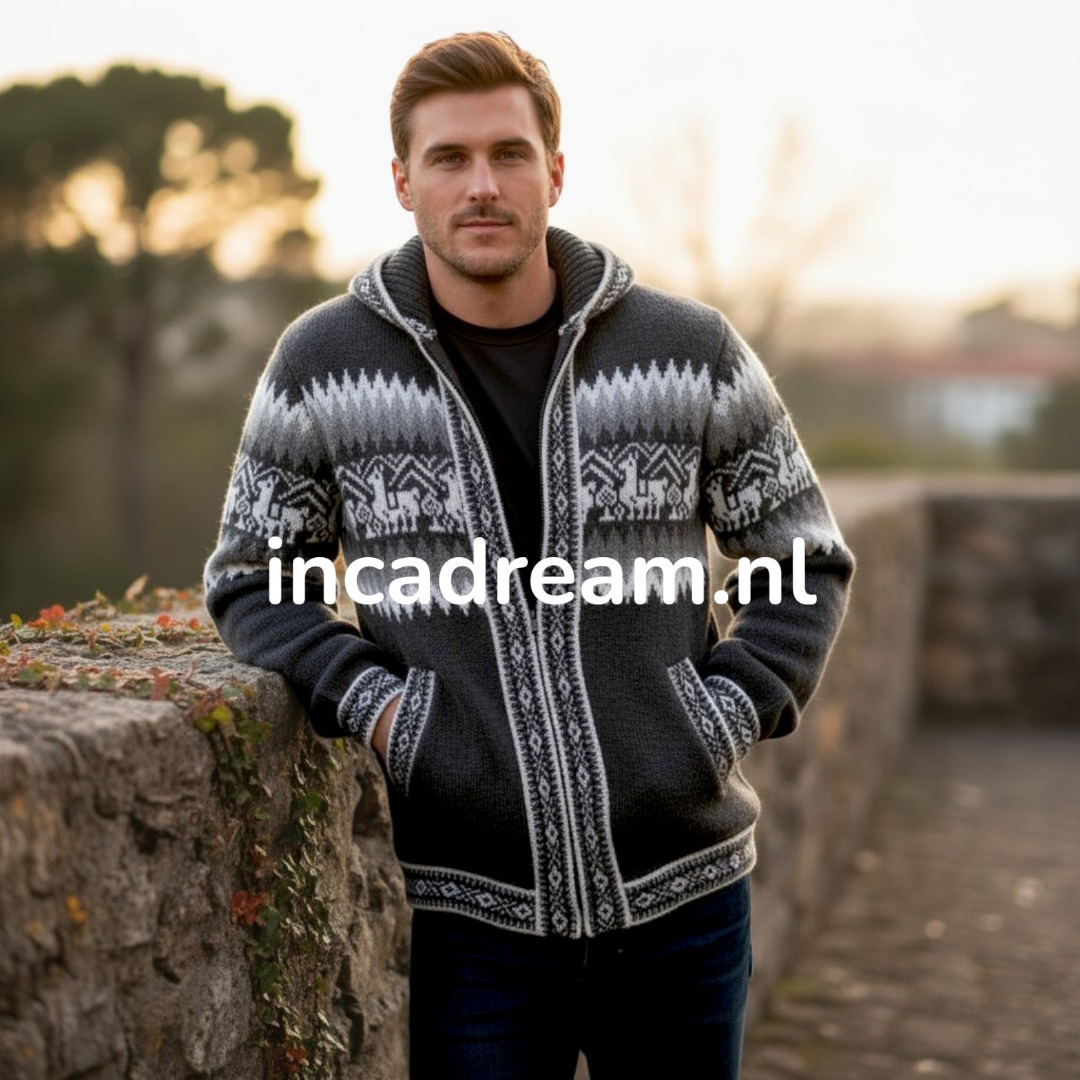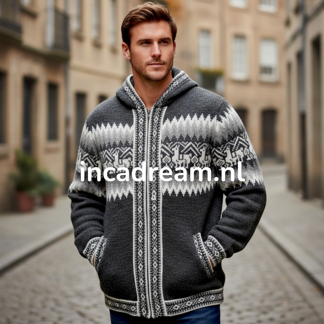 Alpaca is een hypoallergene wol die geen lanoline bevat en dus zachter is dan schapenwol en prikt niet, met een klassiek Andespatroon aan het borst voor en achter.
