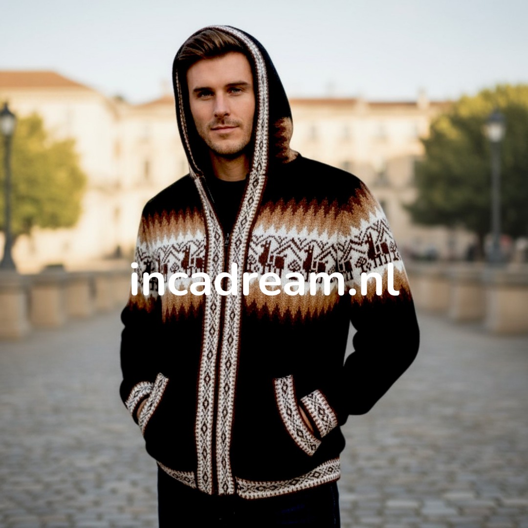 Alpaca is een hypoallergene wol die geen lanoline bevat en dus zachter is dan schapenwol en prikt niet, met een klassiek Andespatroon aan het borst voor en achter.