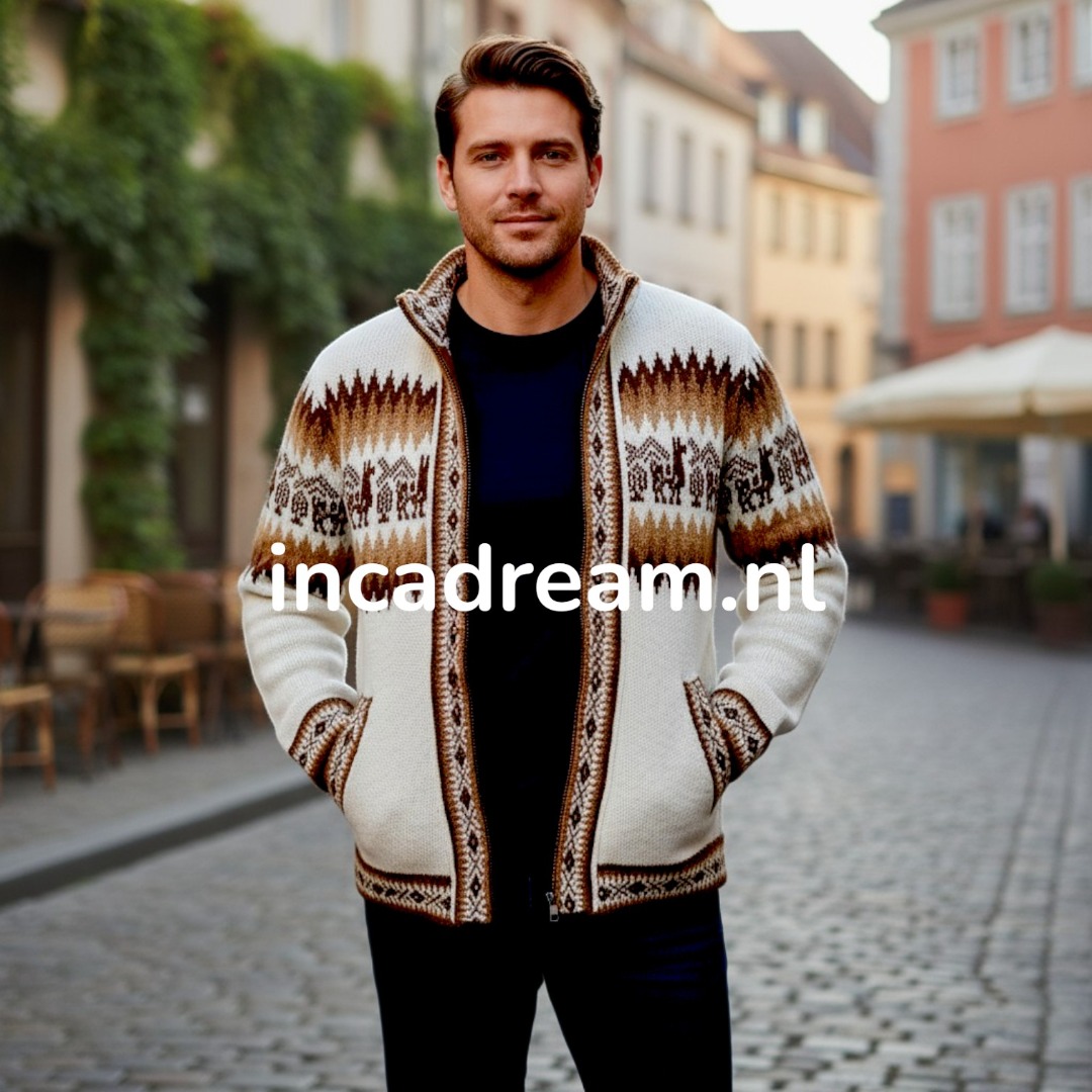 Alpaca is een hypoallergene wol die geen lanoline bevat en dus zachter is dan schapenwol en prikt niet, met een klassiek Andespatroon aan het borst voor en achter.