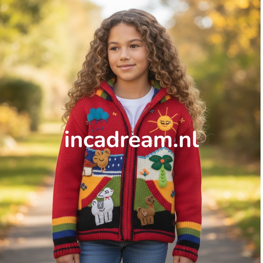 Deze Peru rode gebreide jasje met ritssluiting en twee zakken is lekker warn en vrolijk door de knalkleuren combinatie en de mooie borduursels voor en achter .