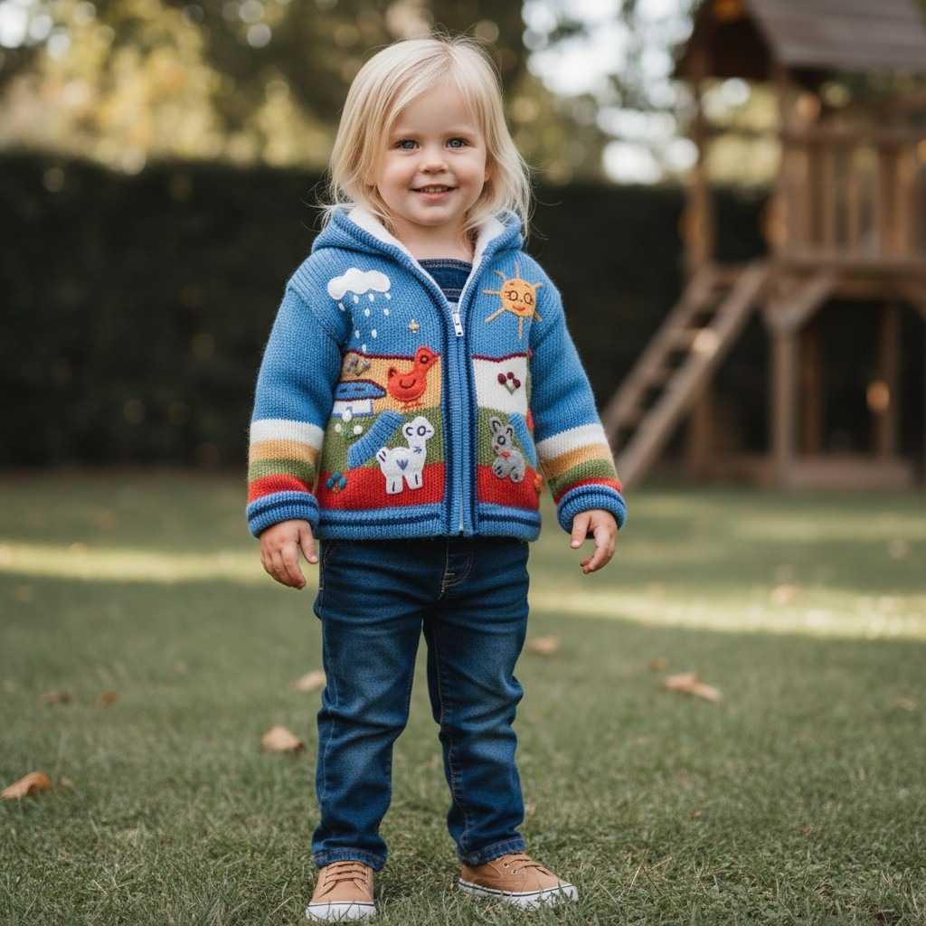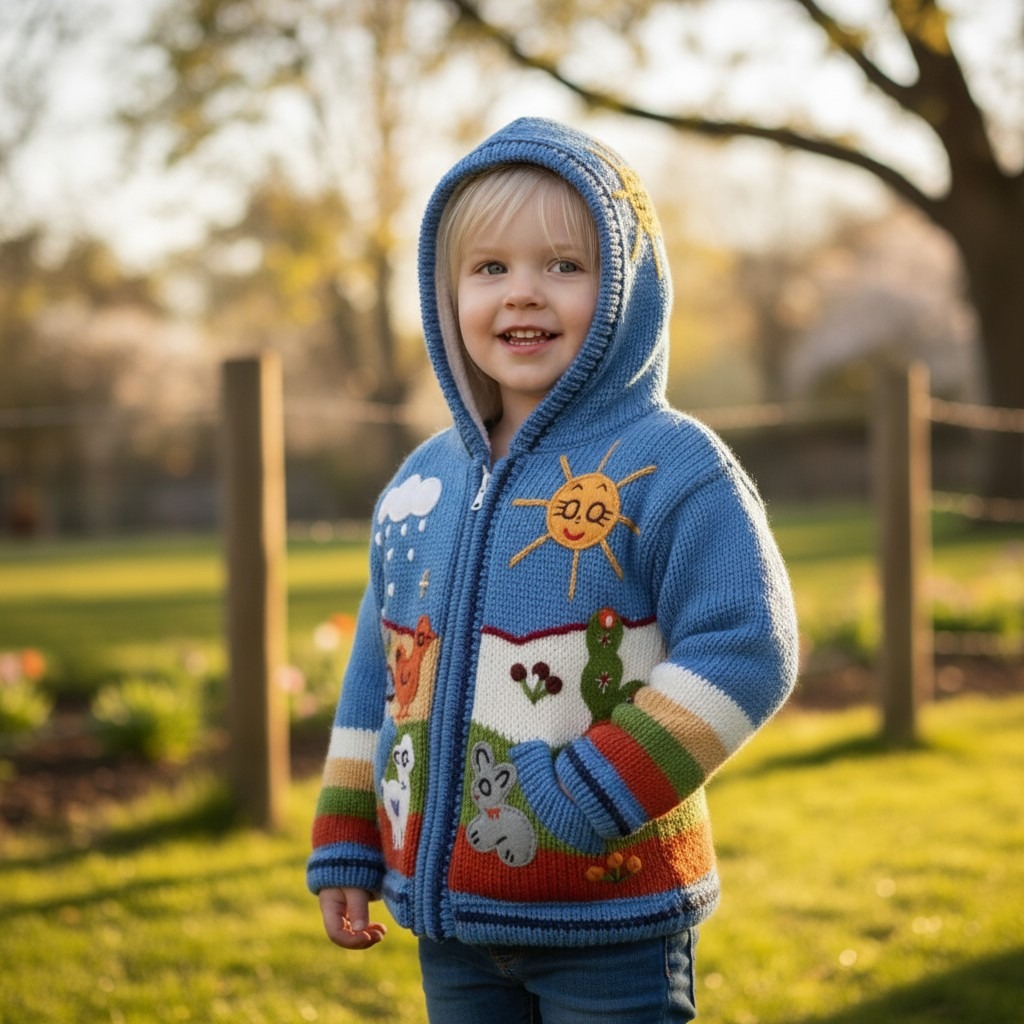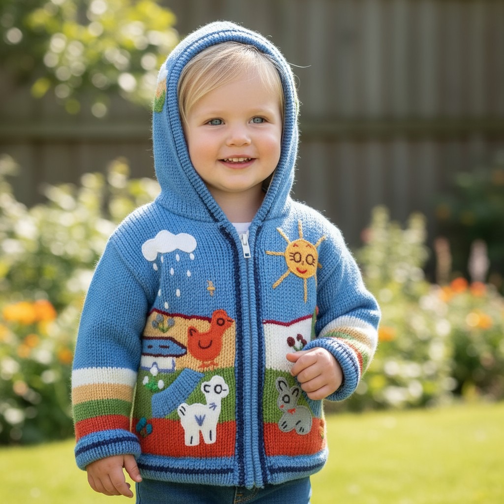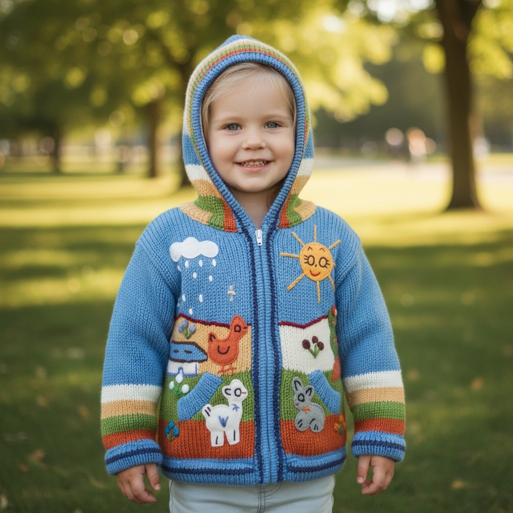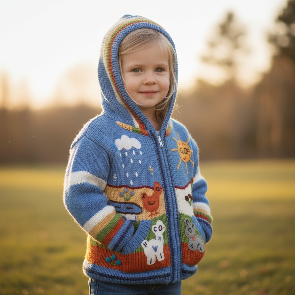 Dit warme en stijlvolle kindervest met capuchon heeft kangaroo-zakken aan de voorkant, Dit kleurrijke en warme kinder vest kun je dragen als jas in de winter maar is ook zeer comfortabel op frisse zomerdagen. Verkrijgbaar in vele kleuren en in de maten 74 tot 126. De Arpillera vesten zijn gemaakt van poliacryl wol en worden gemaakt in Peru met respect voor dier en de medewerkers. De vesten kunnen gewassen worden met een beetje wolwasmiddel op 30 graden wolwasprogramma.