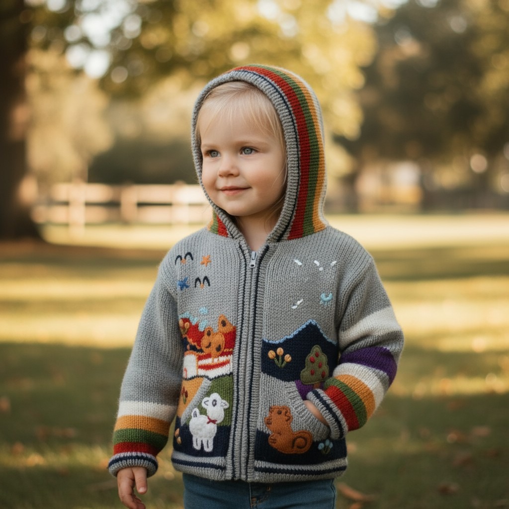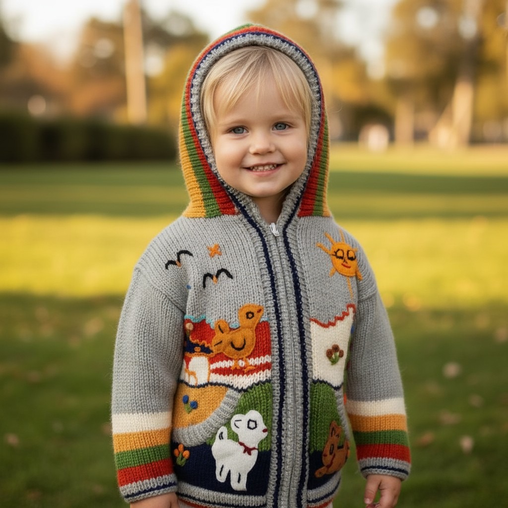 Dit warme en stijlvolle kindervest met capuchon heeft kangaroo-zakken aan de voorkant, Dit kleurrijke en warme kinder vest kun je dragen als jas in de winter maar is ook zeer comfortabel op frisse zomerdagen. Verkrijgbaar in vele kleuren en in de maten 74 tot 126. De Arpillera vesten zijn gemaakt van poliacryl wol en worden gemaakt in Peru met respect voor dier en de medewerkers. De vesten kunnen gewassen worden met een beetje wolwasmiddel op 30 graden wolwasprogramma.