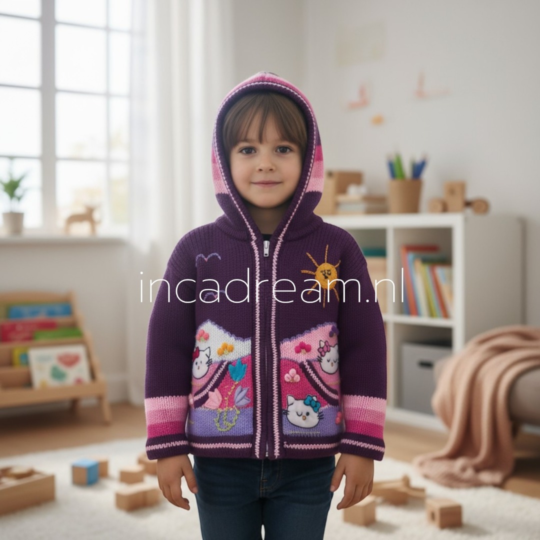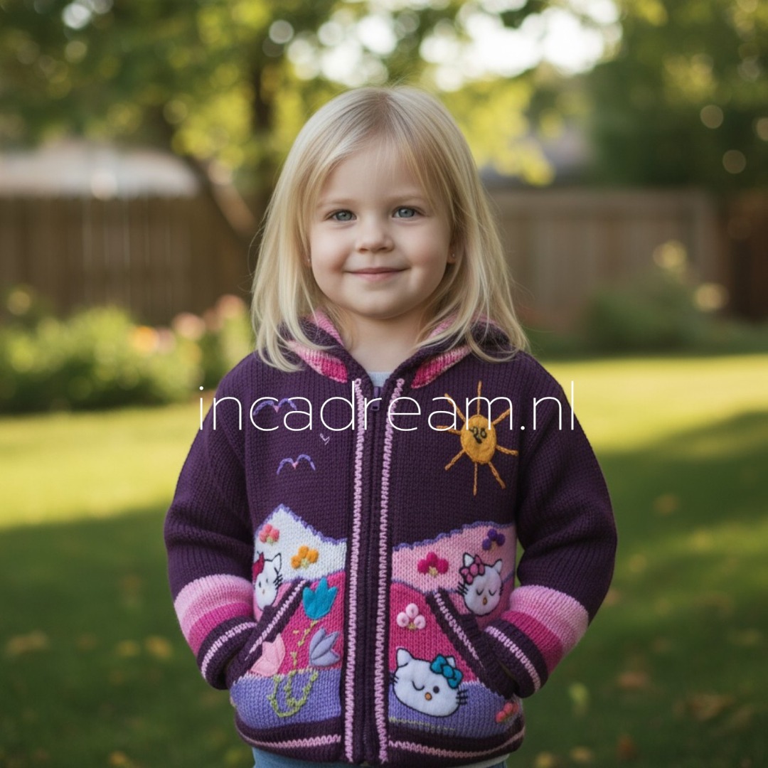 Deze schattige handgeborduurde Paarse gebreide sweater uit Peru is de perfecte cadeau voor a baby or kindje.